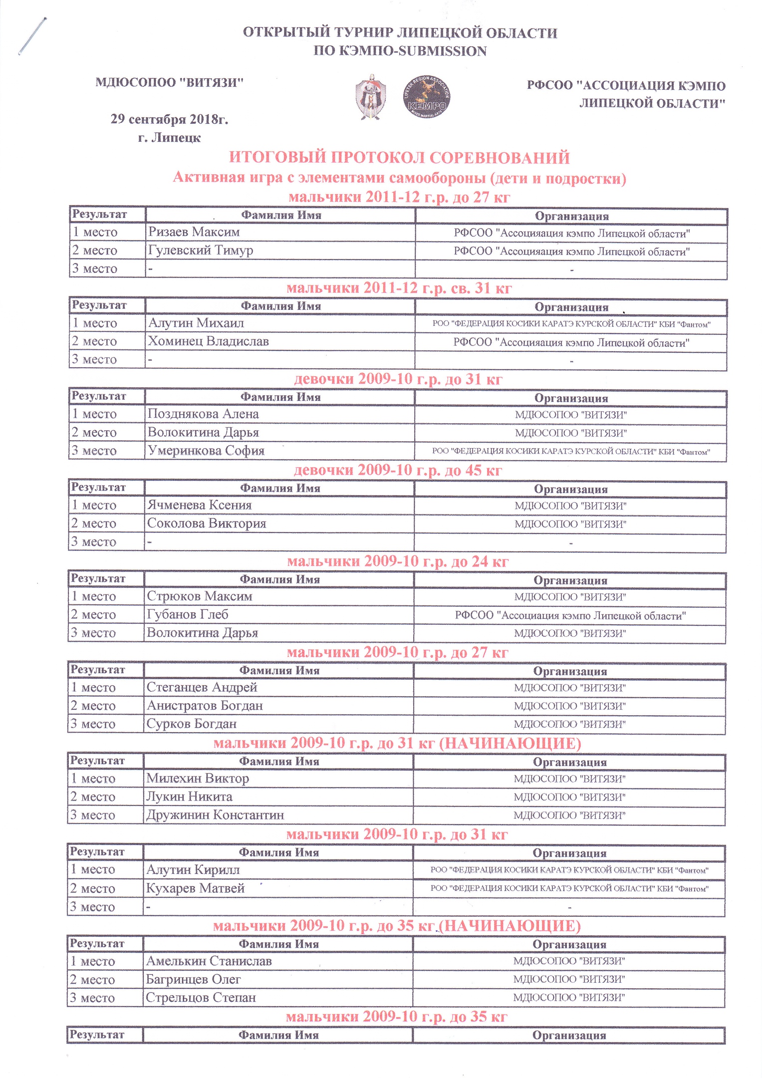 РЕЗУЛЬТАТЫ ОТКРЫТОГО ТУРНИРА ЛИПЕЦКОЙ ОБЛАСТИ ПО КЭМПО-SUBMISSION (29.09.2018г.)