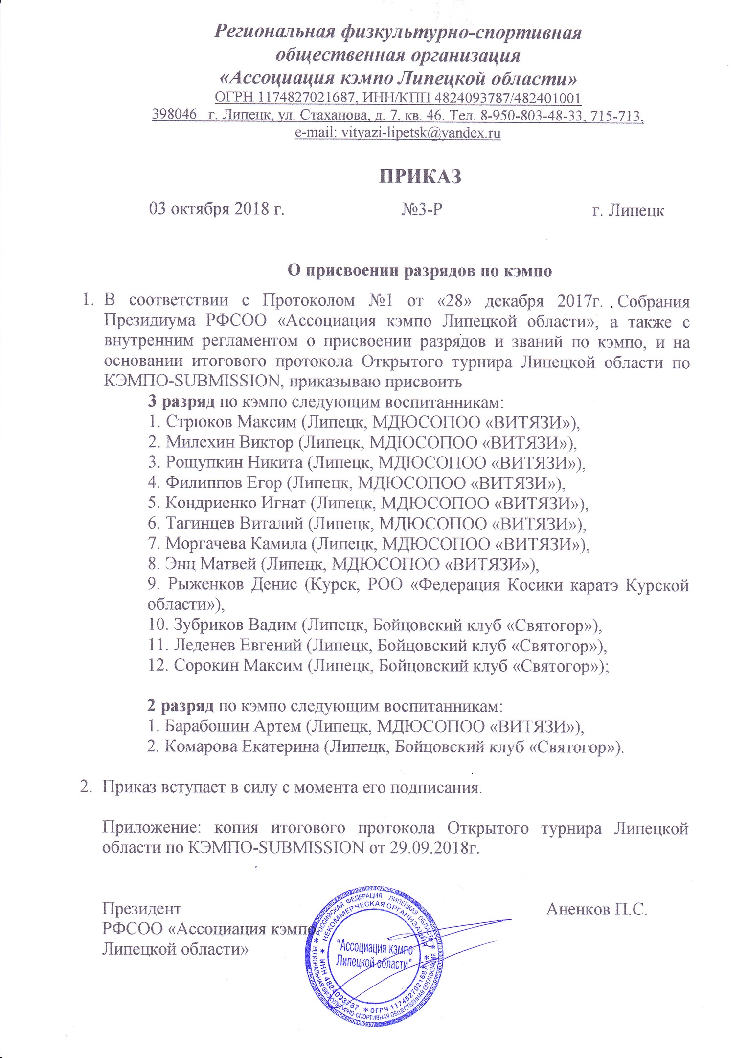 По результатам турнира выкладываем приказ о присвоении разрядов.