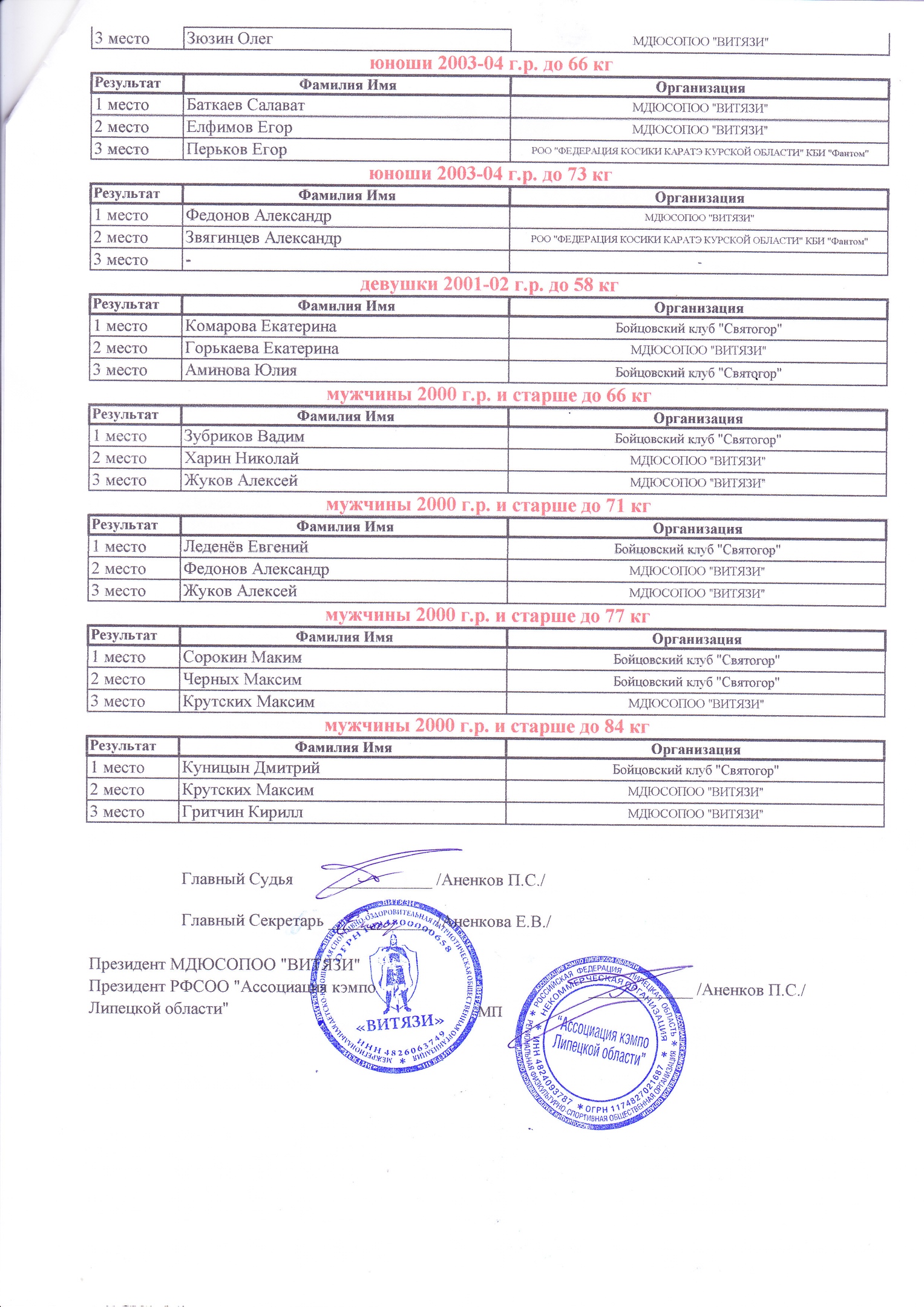 - клубы Липецкого отделения "ВИТЯЗЕЙ": AnenkovTeam, ChernetsovTeam, DodinTeam (тренеры Аненков П., Чернецов Ю., Додин А.);